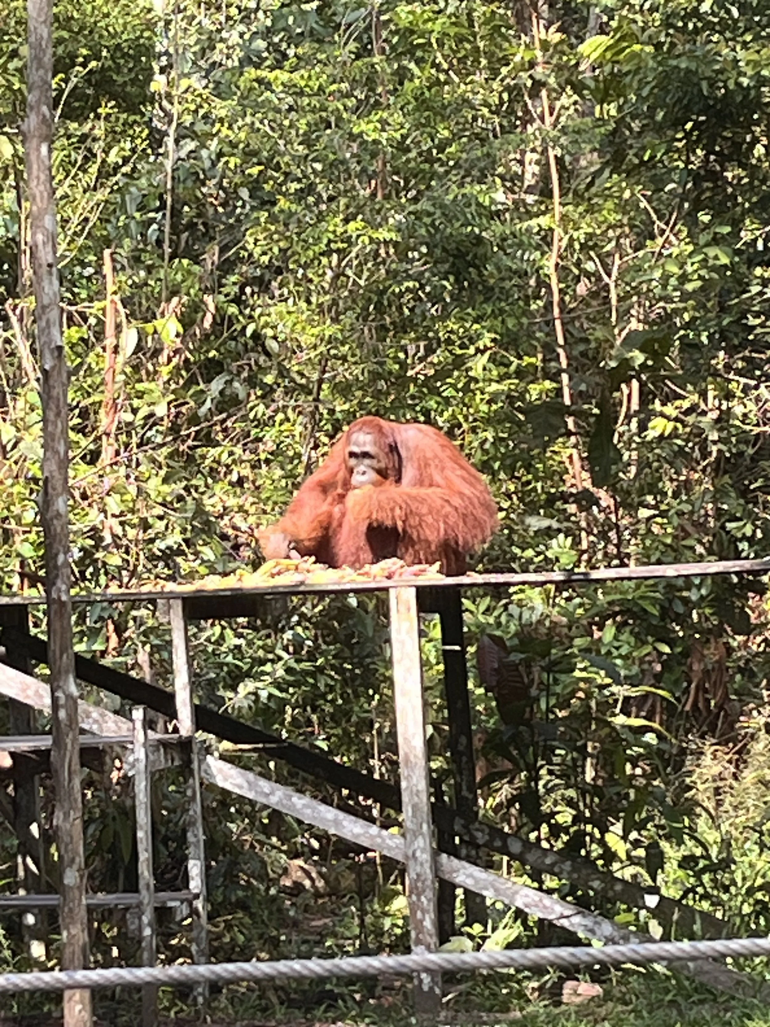 At about 2.00pm we got off the boat and walked through the jungle to a feeding station which was a platform. Whilst they put out food it is not their only food and it is just a supplement really. The walk was about a kilometre and there was some seating. All was quiet and there was no sign of an orangutan. The ranger made a whoop type noise every now and then and then suddenly a large alpha male appeared and climbed up some trees behind the feeding station as if to view what was going on around him and he was also watching us. The rangers came and put out some food – bananas, sugar cane or something like that and the male made a range of noises which it was explained was to warn other males away.