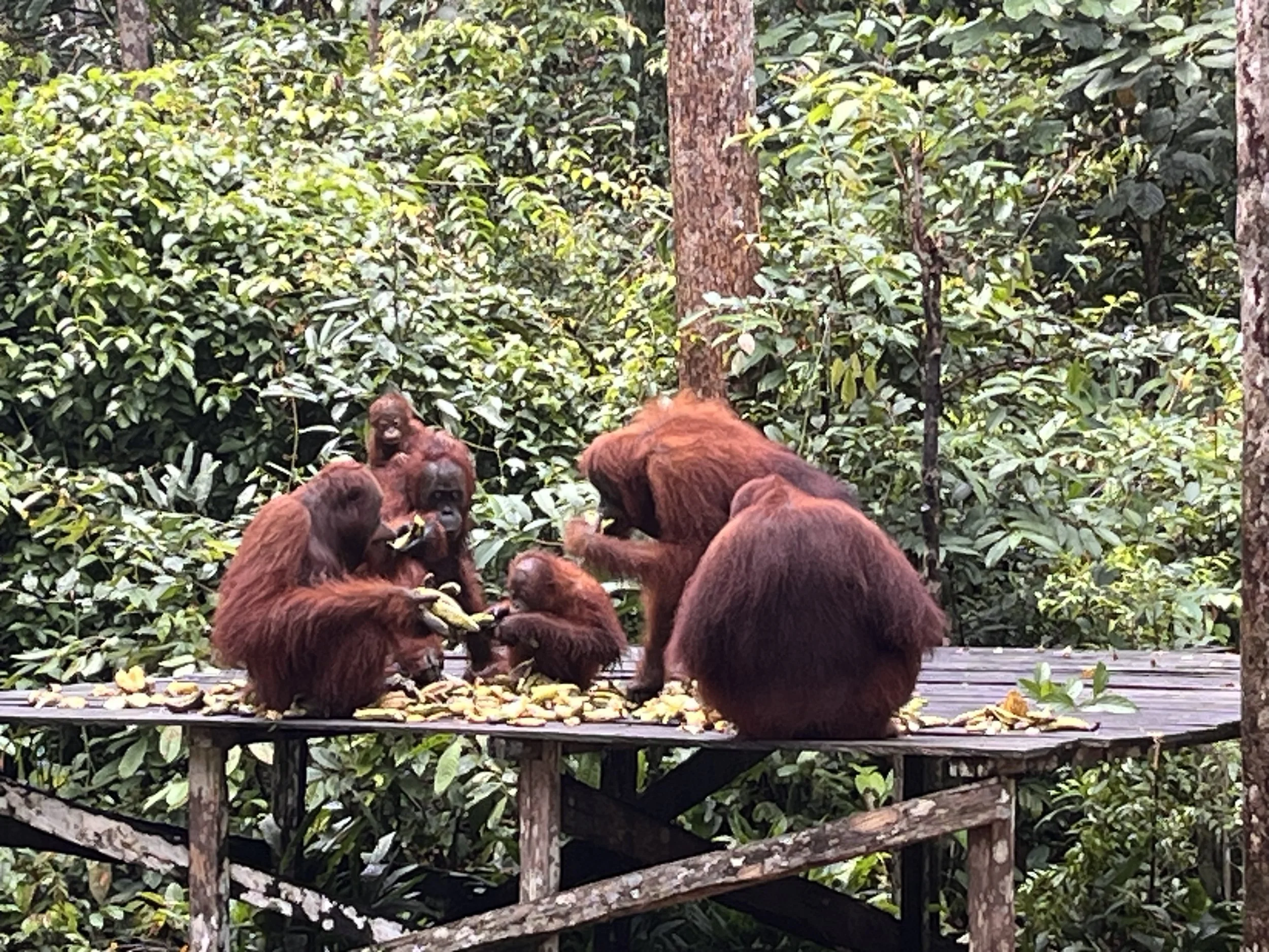 We motored on and there was less traffic as it was single file really and it as nice to chill and admire nature’s beauty in front of us. We then eventually came to a stop in the reeds where we could rest and to have lunch which was nice and then we continued to Camp Leakey and moored against the pontoon where there were lots of other boats bringing visitors like us to the feeding station for 2.00pm.