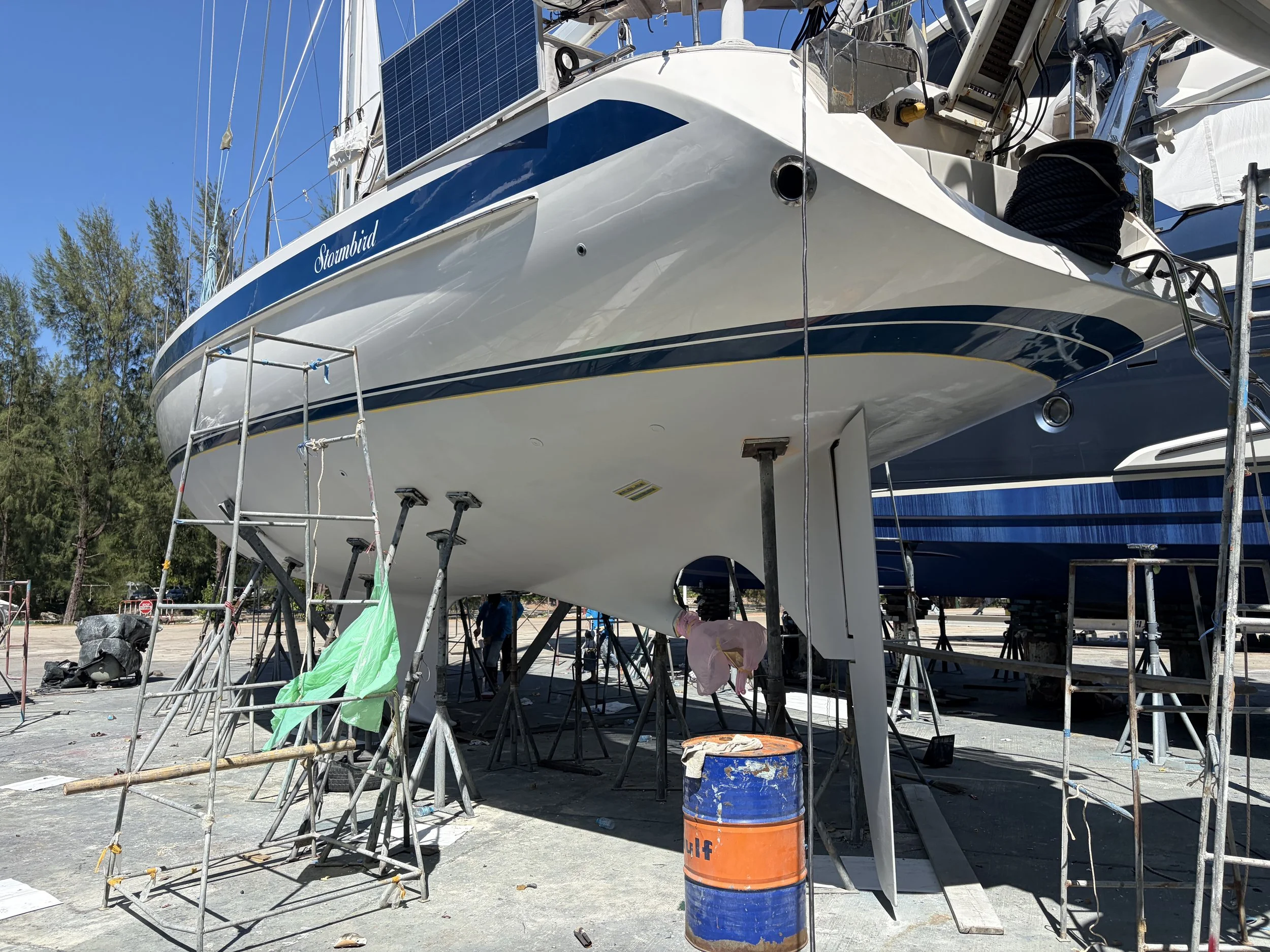 Stormbird had men crawling all over her when I arrived and there were finishing the undercoat of the antifoul. The propeller had been cleaned and the anodes replaced. I caught up with the antifoul man and he knows Stormbird is going back in the water on Monday. I discovered this is now 11.00am not 11.00pm which is much better.