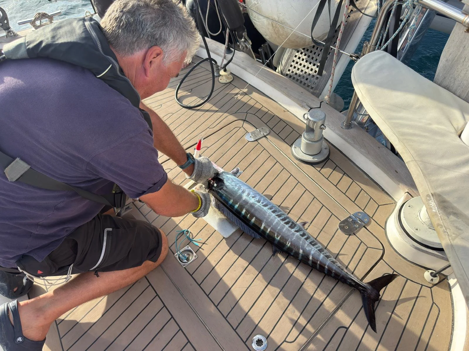 The afternoon wore on and we just chilled and the wind began to strengthen about 4-4.30pm. Then the rod suddenly went and we appeared to have caught a fish. I got the gloves and wound in slowly. Every now and then the line would wiggle as the fish tried to get away. I continued to wind and eventually I saw that we had caught quite a large wahoo – this is a white tasty fish. It was a sort of black, blue with silver stripes and quite streamlined – see the picture of the day.