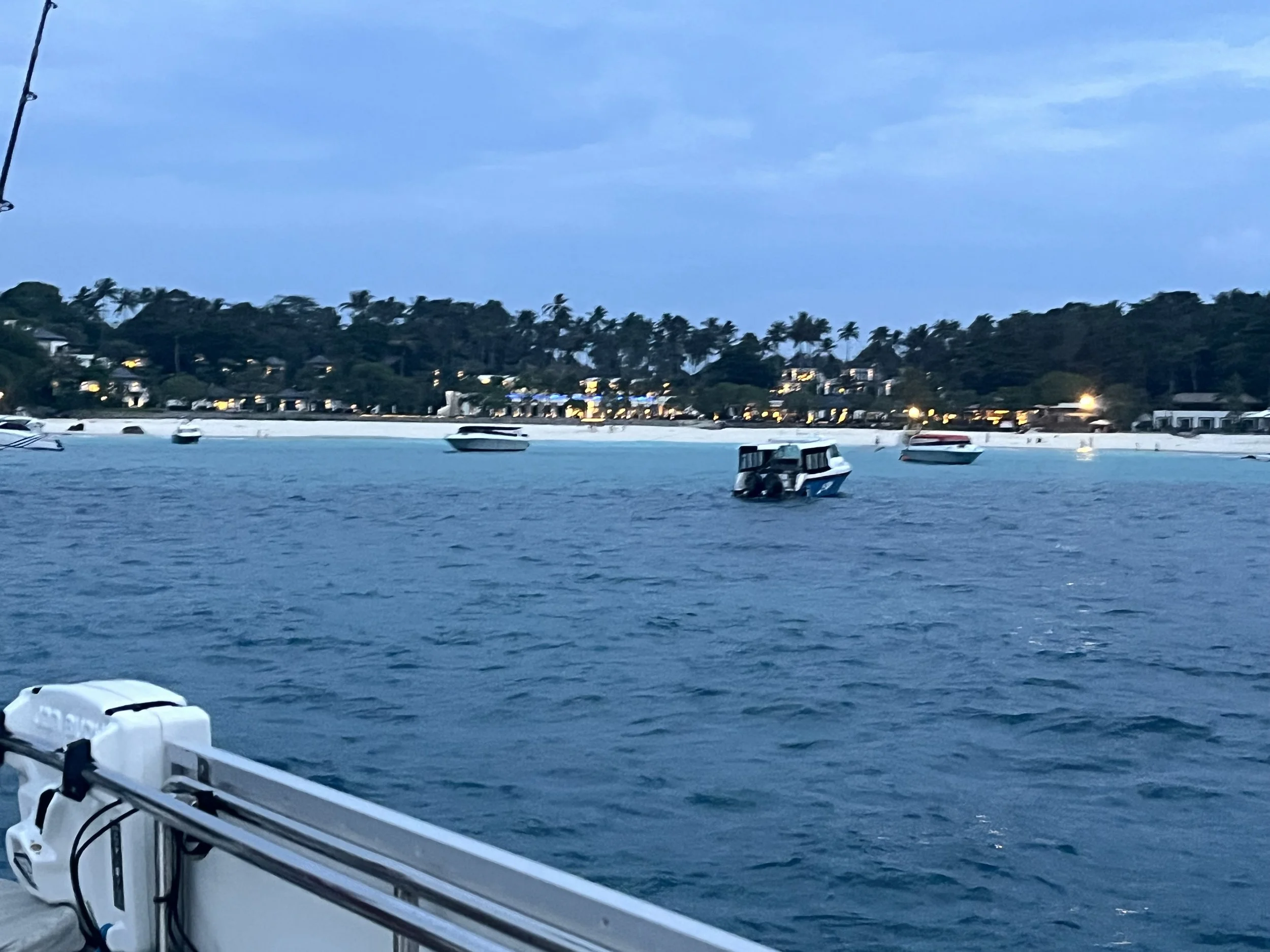 We had a beer and marvelled at what a beautiful bay this was. There was a lovely white sandy beach with the resort quite tastefully situated with the palm trees around it and up the hill which mingled with the jungle type trees. The bay was a sort of small horseshoe shape with foliage all around. The water, despite the light was clear and blue and if we had sun would I am sure look stunning.