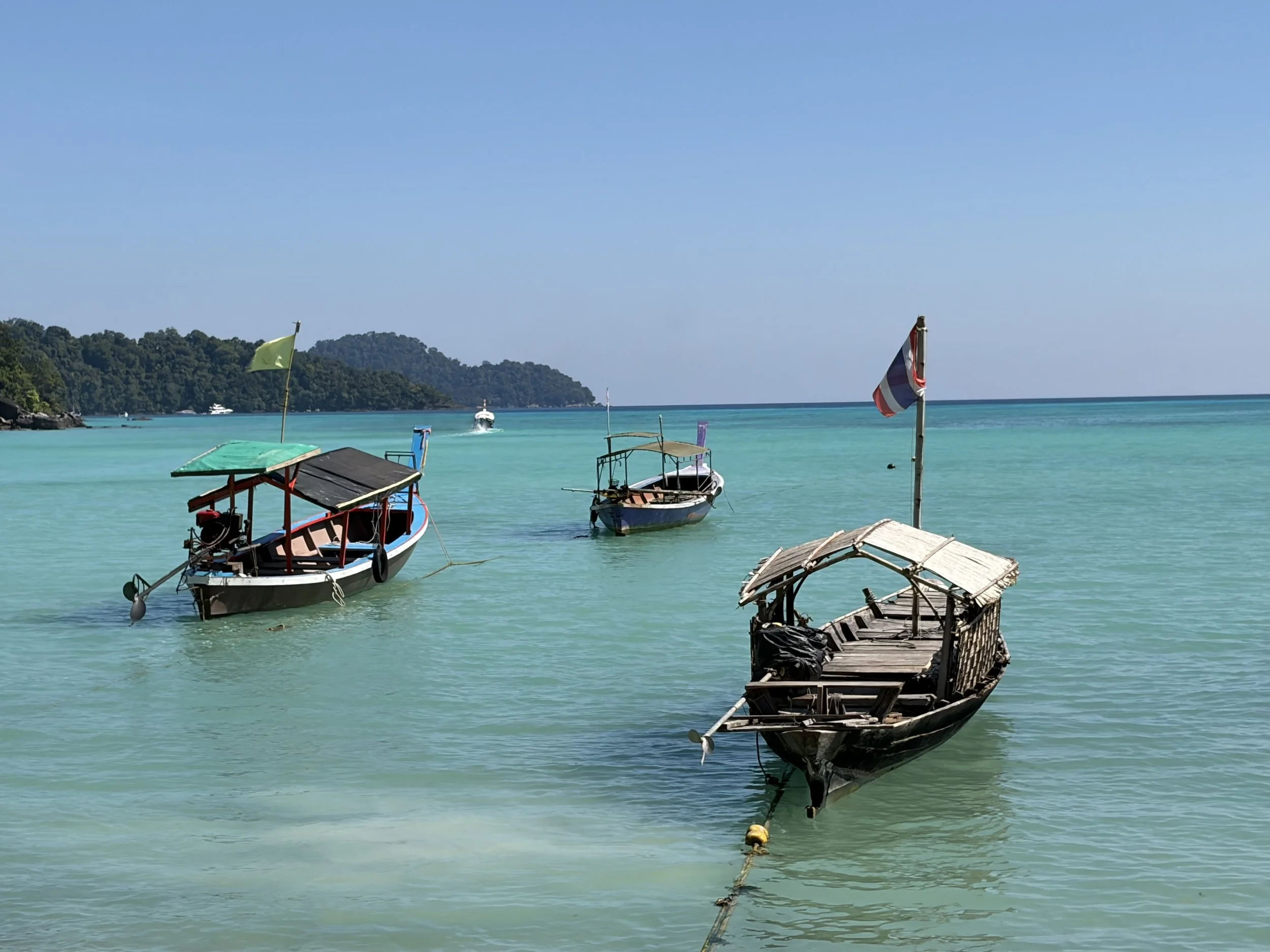 As we arrived at the islands we noticed how lovely and blue the water was and we came into a bay with blue water and coral bommies. We edged in and reversed up to a beach which had a whole load of huts on it. These were the huts of the Moken People who live on this Island. The Moken people were nomadic sea travellers from the Mergu Archipelago in present day Myanmar to the South and the Sulu Sea of the Philippines. Some of them have become Thai and the others have no country to which they are associated.