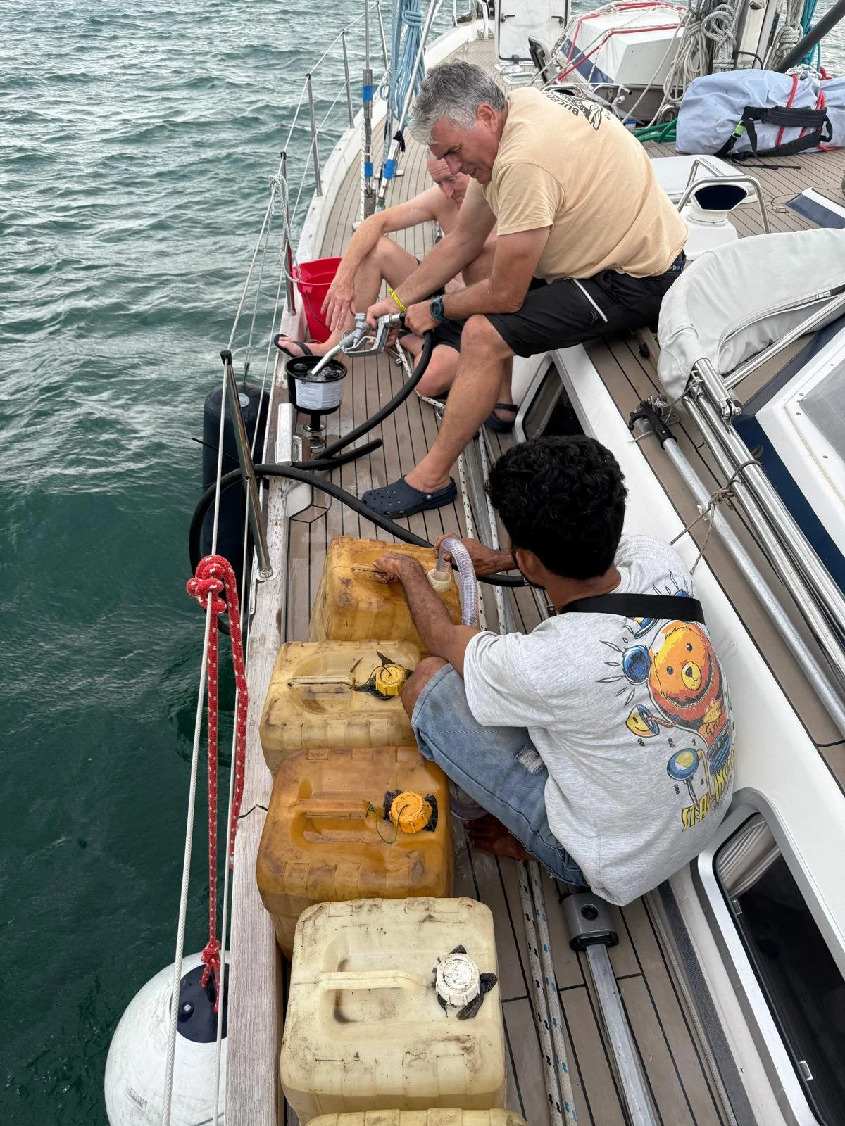 The picture of the day is of the diesel filling. They have very few ashore or alongside filling here and it is always by jerry can. When you need large quantities this is an issue. However we have done it and hope the quality is good enough.