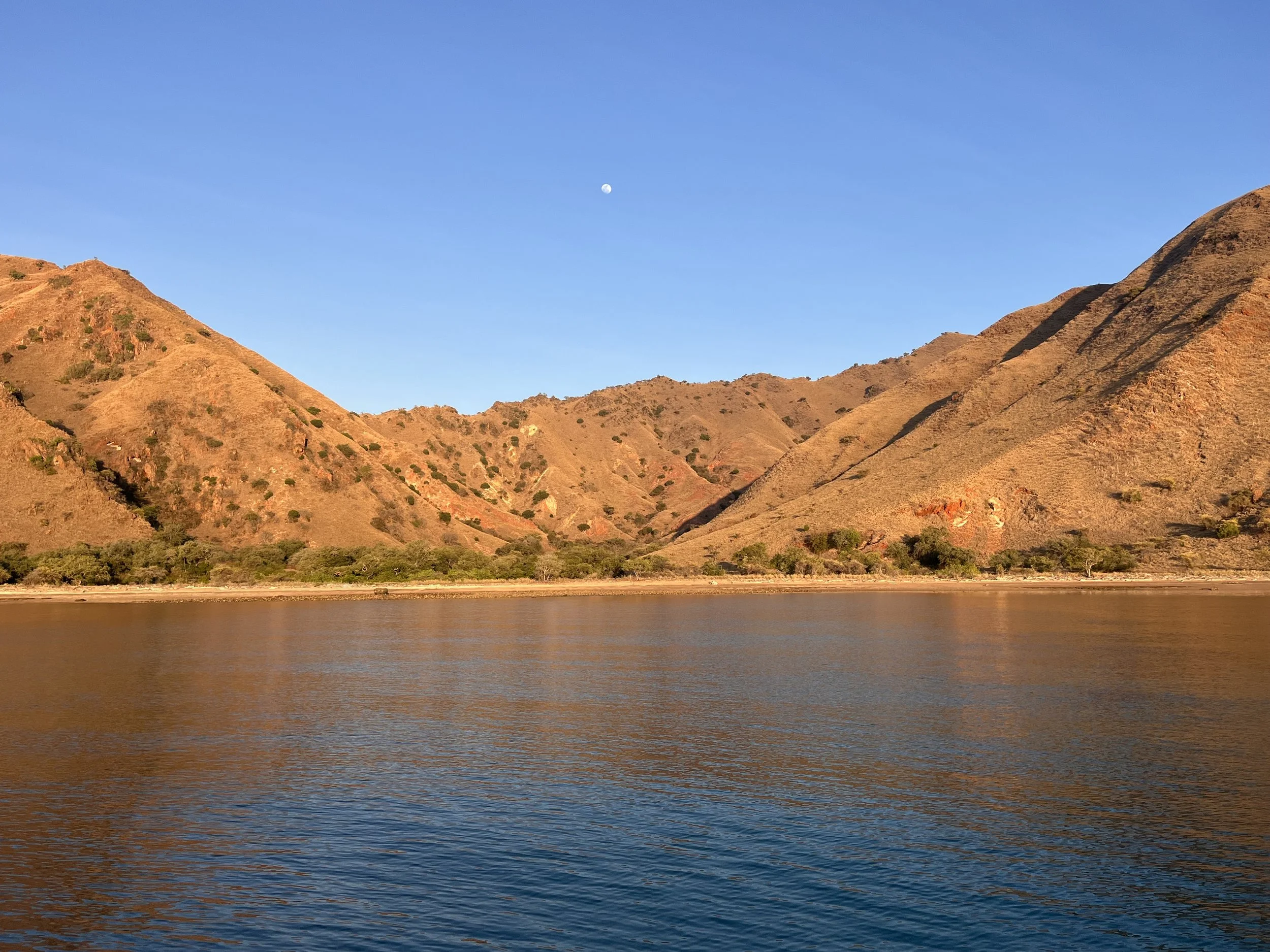 A dinghy approached us and said hello and they were from a tourist boat and had been diving. They were from Belgium and France and wanted to know where we were from and where we were going. We chatted and waived goodbye and carried on sailing slowly until we were barely making 2 kts. We decided to turn off the generator and then motor our last hour before we got to the proposed anchorage at the top of Komodo Island. We came to the top after about an hour and motored into the bay. It was a large, curved bay with various reefs and we needed to keep into the centre of the bay before we could ease into a sandy patch just outside the reef. The sides of the bay rose up quite steeply and they were a light brown colour with the odd bush here and there and quite mountainous with rock showing some it quite red in colour indicating iron I think.