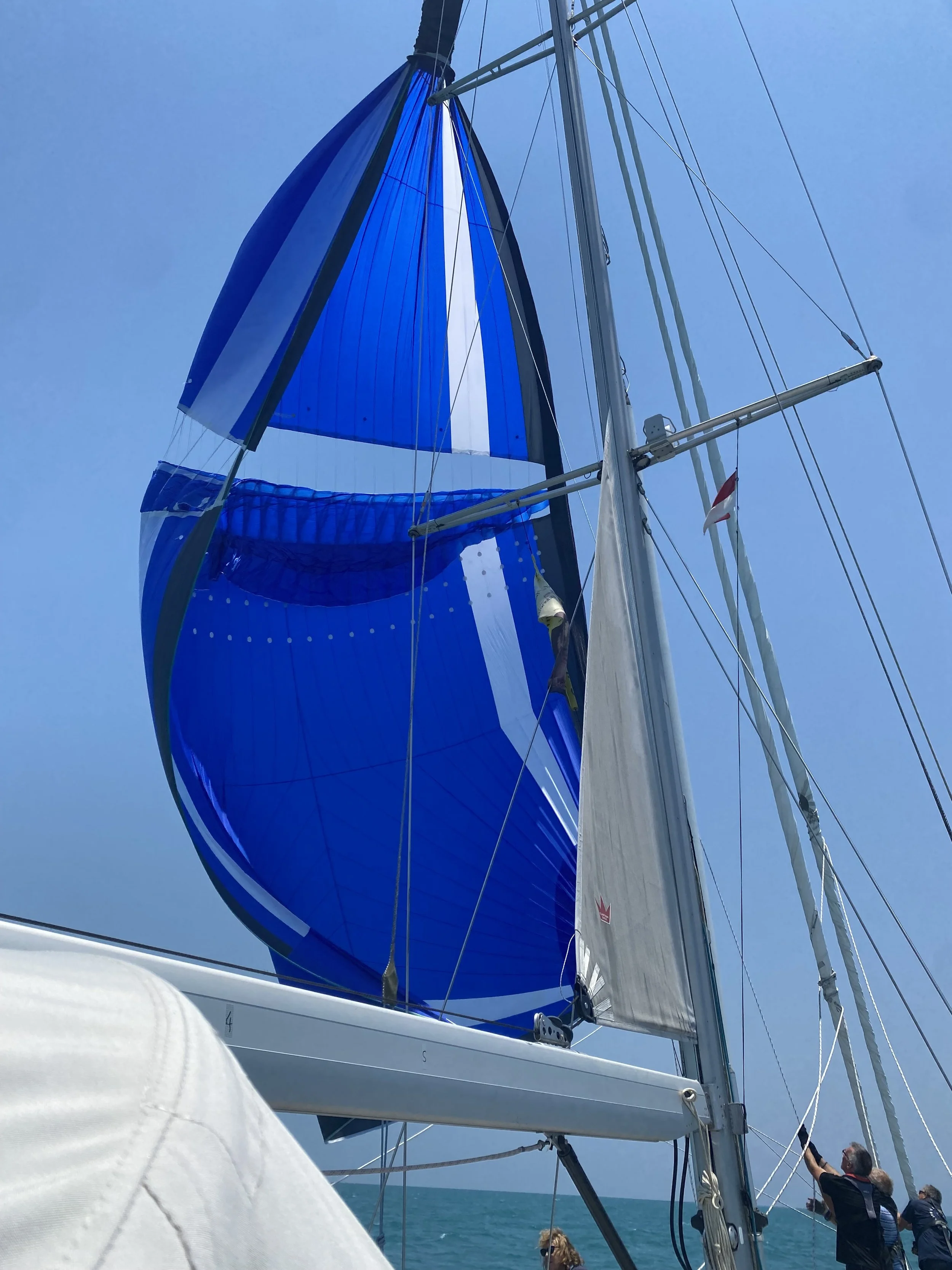 When we were ready we lifted the sail on the halyard and then pulled the snuffer and up she flew. We were not quick enough to pull in the sheet and initially it twisted but I was able to pull out the twist and she was flying quite nicely with a little adjustment and we had to adjust a few sheets. We were doing about 5-6 kts in about 7-8 kts of wind. We continued sailing for a while and then unfortunately the wind died again so we had to snuff the parasail and get it down and on to the deck which went well. We then laid it on the deck and tied it to the rail on the port side and tidied up the lines. It had been good to sail it again and hopefully we will do so again soon. See the picture of the day.