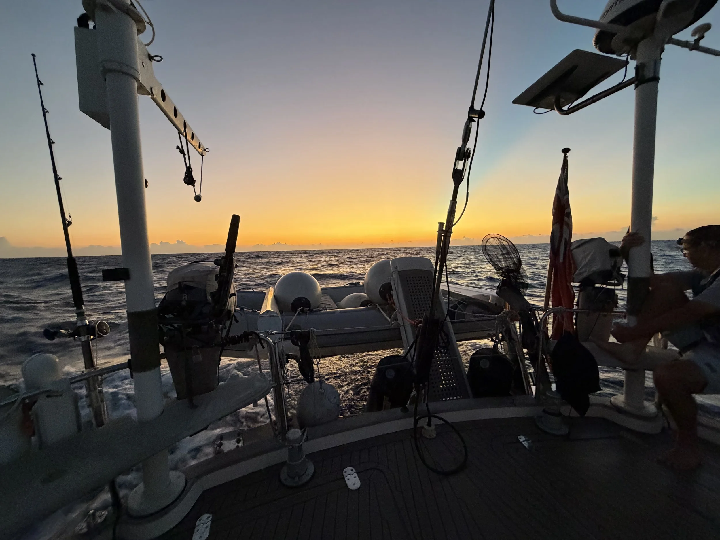 Rhys and I had the 5.00am to 8.00am watch and we were still sailing well with the Blue Baron and had been all night. One of the pleasures of sailing long distances is that you get to see greats sunsets and sunrises. When we came on watch it was pretty dark apart from some moonlight from the moon which rises about 1.30am here. You can of course still see the stars twinkling away. As the day dawns light gradually begins to appear and you can begin to make out the horizon and the black sea. Then more definition appears and you begin to get a little glow from the East which is like a dimming light which gradually increases lighting up the sky and any cloud cover. The stars disappear and go to bed. The glow increases further and the stern of the boat which points East as we are going West moves from being a silhouette to more defined shapes. Eventually after some time and increasing light the sun shows its face and rises up above the horizon to greet you. You can feel its warmth straight away. It is a magical moment and it feels good to be be alive. The picture of the day is a snapshot of this moment.
