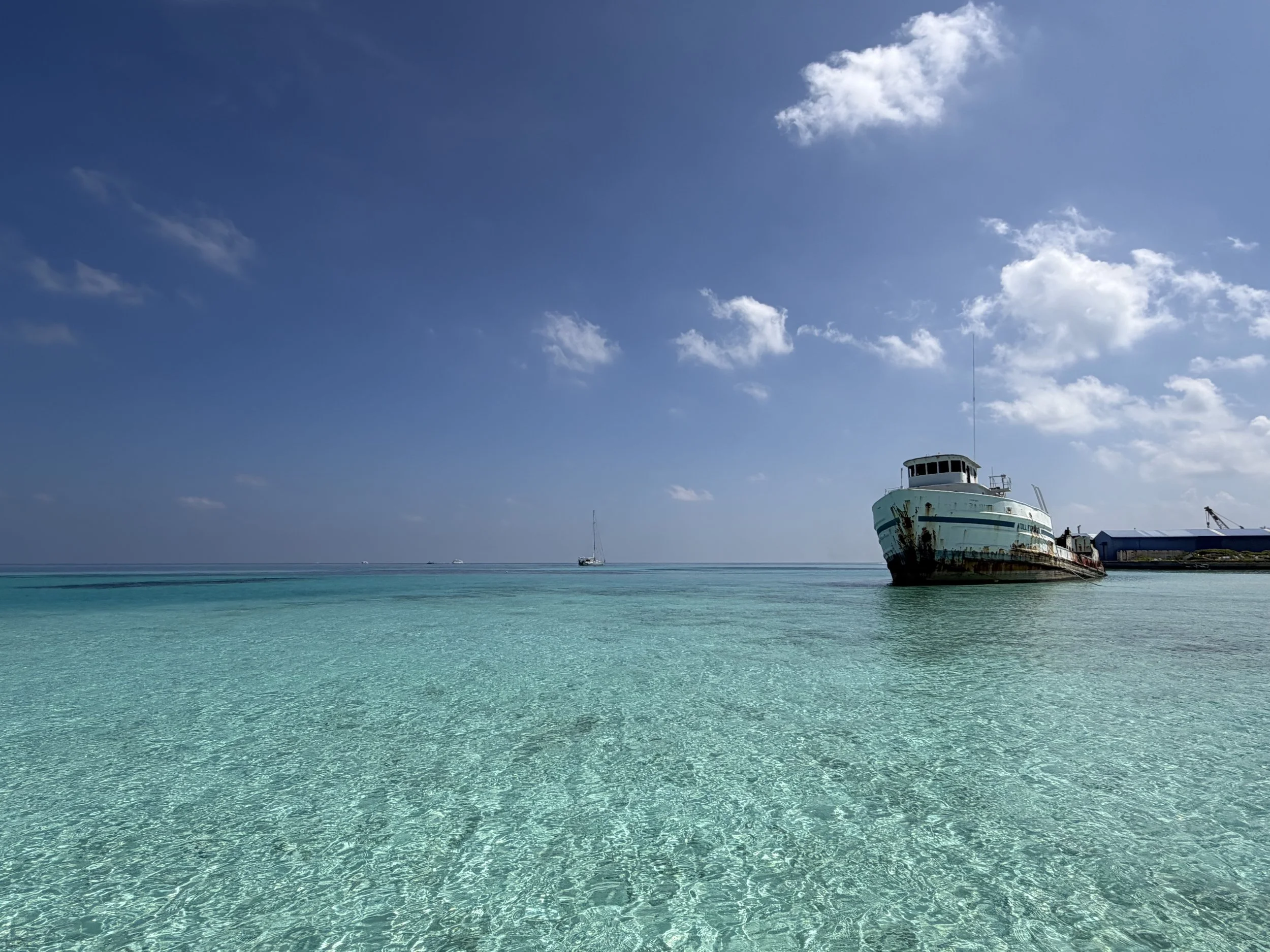 The picture of today is the wreck we swam around in Hummafuschi. You can see Stormbird anchored in the background