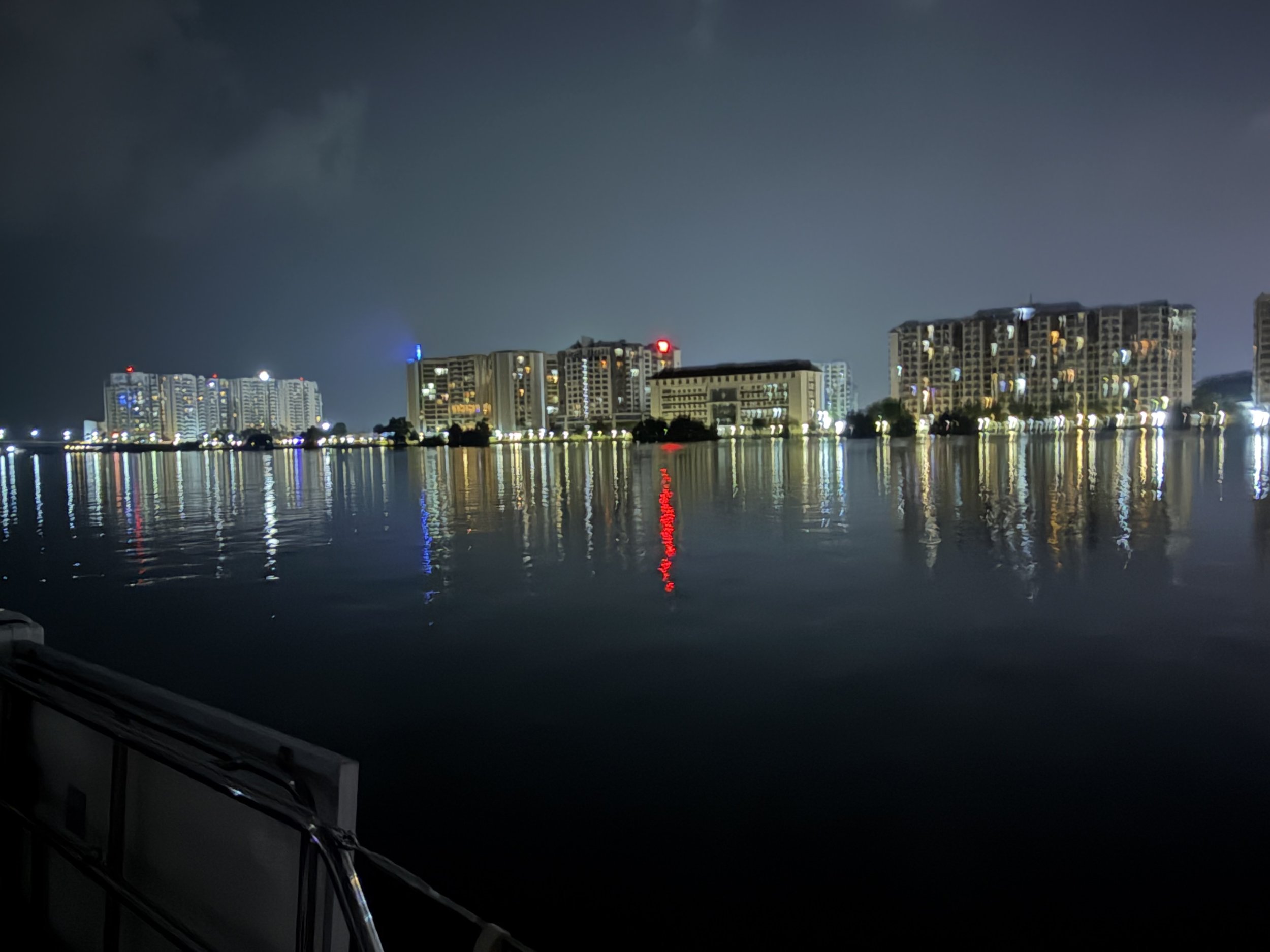 The picture of the day is the view from our cockpit across at night to the other side of the channel