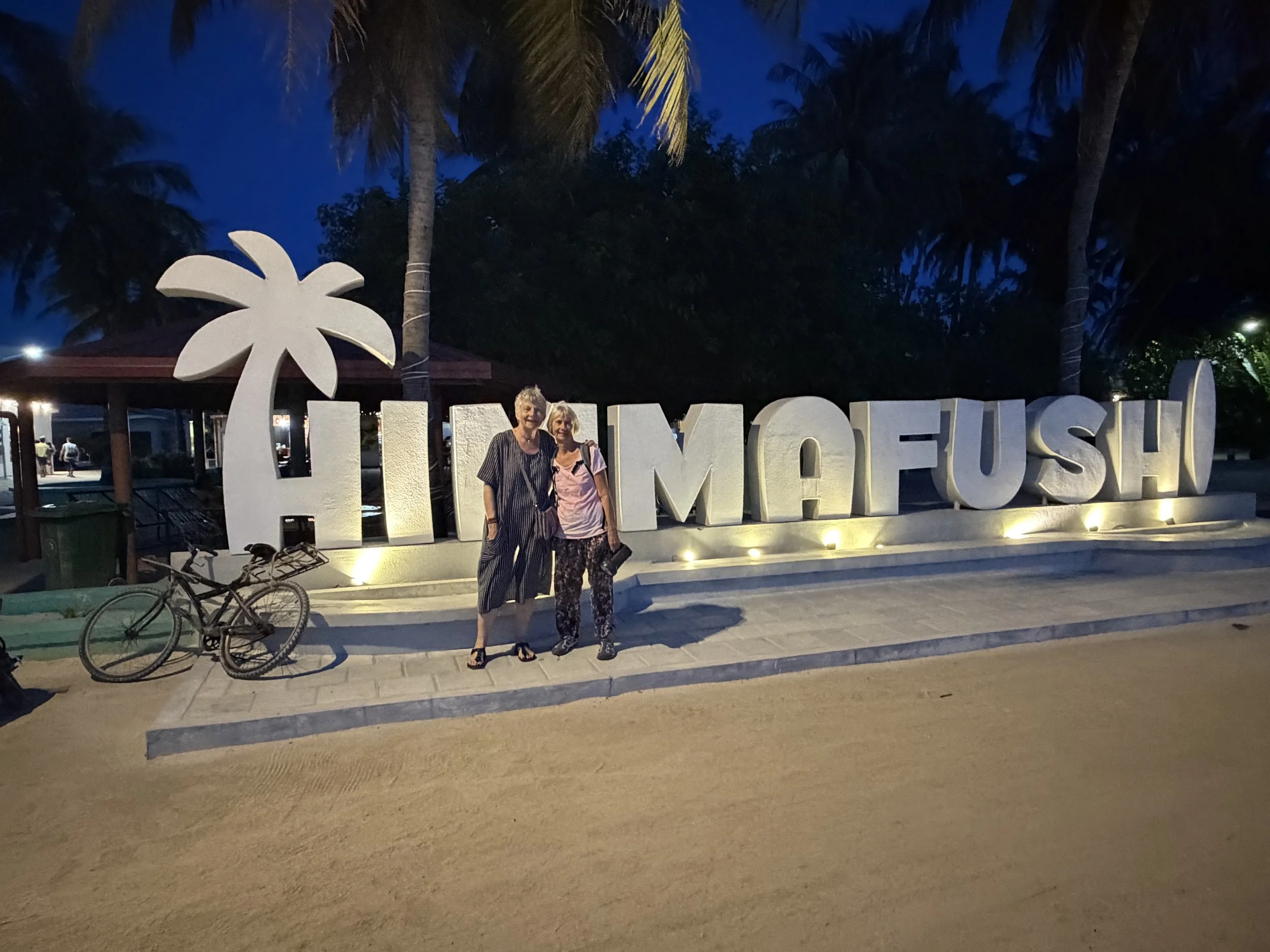 The picture of the ladies in front of the Himmafushi sign.