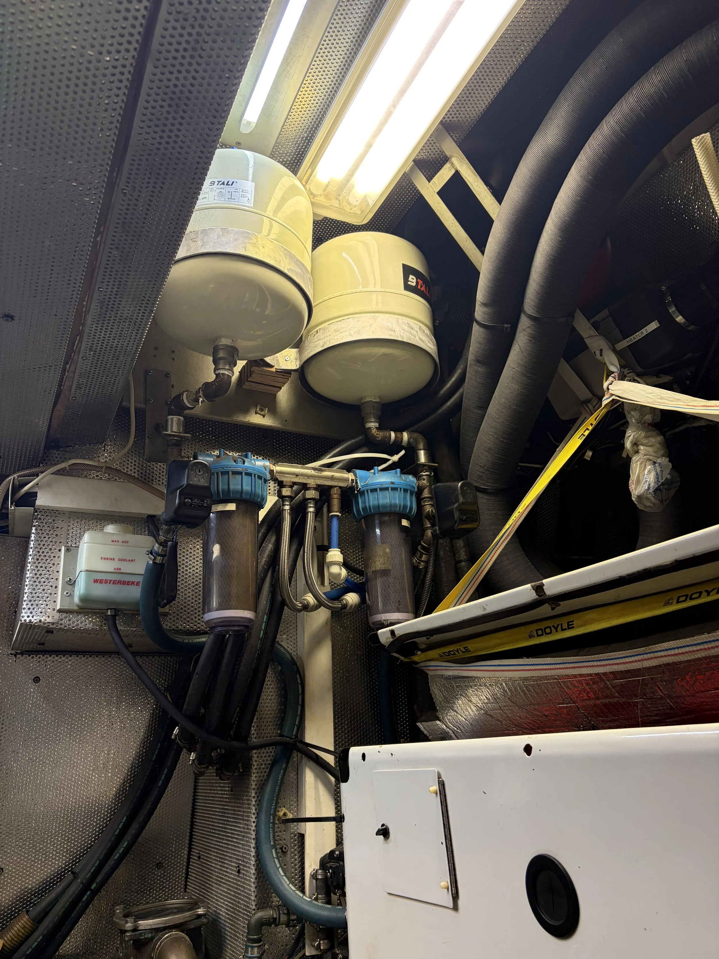 Once they left I had lunch and then set about sorting out the galley and the forepeak cabin. I then waited for the plumbers to come to sort out the pressure tanks. They came about 3.00pm and set about fitting the second pressure tank. This took them some time and they used all sorts of my tools etc. They changed the freshwater filters for me at the same time. Initially they had a little leak bit this was resolved. This meant I had two pressurised tanks which meant that when you used the tap the pumps did not have to operate.