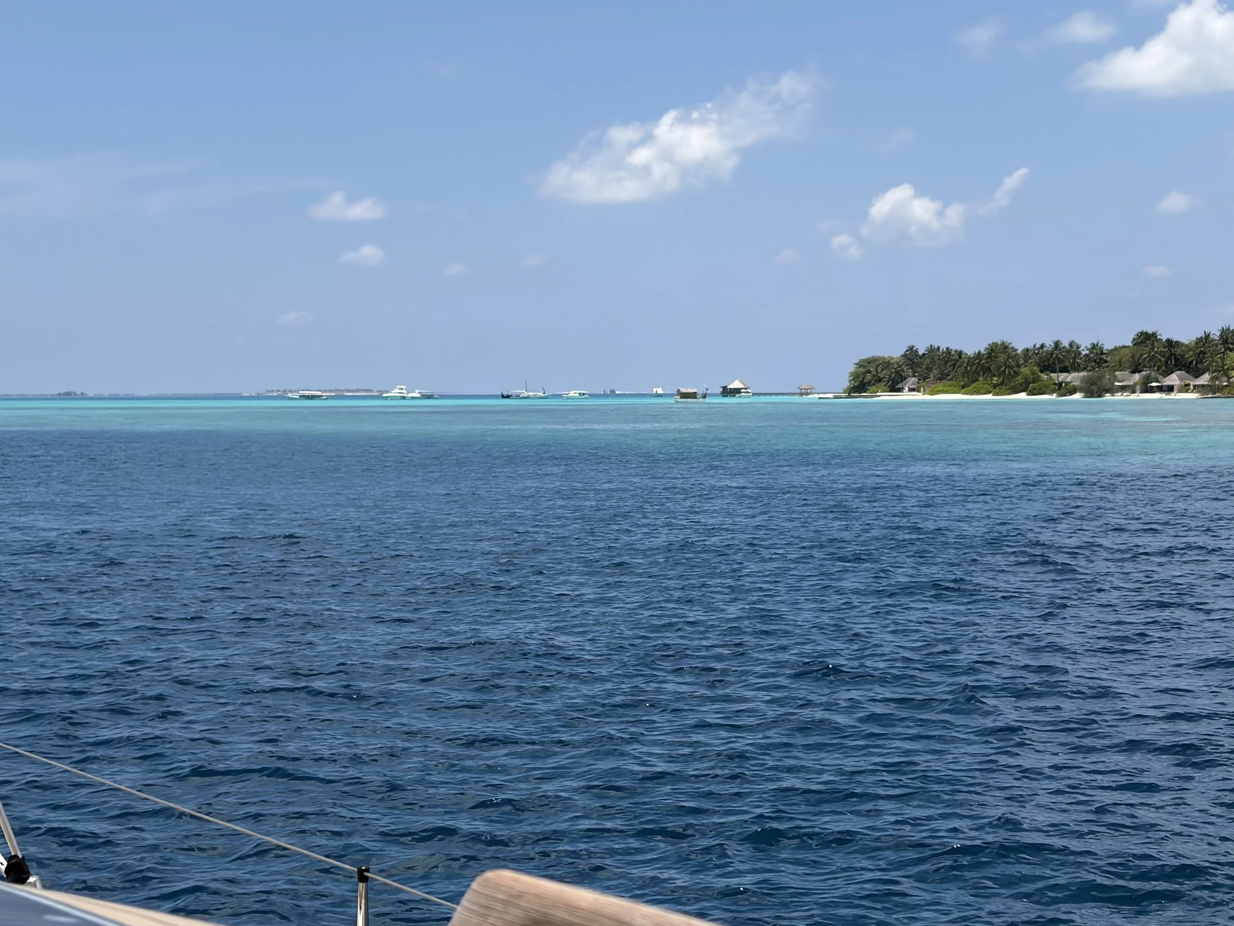 We motored on and came passed the end of the North Male Atoll and then passed the reef which we could see from the colour change in the water. We motored on round and could see the islands and some resorts on them and eventually found a break in the reef and motored through.