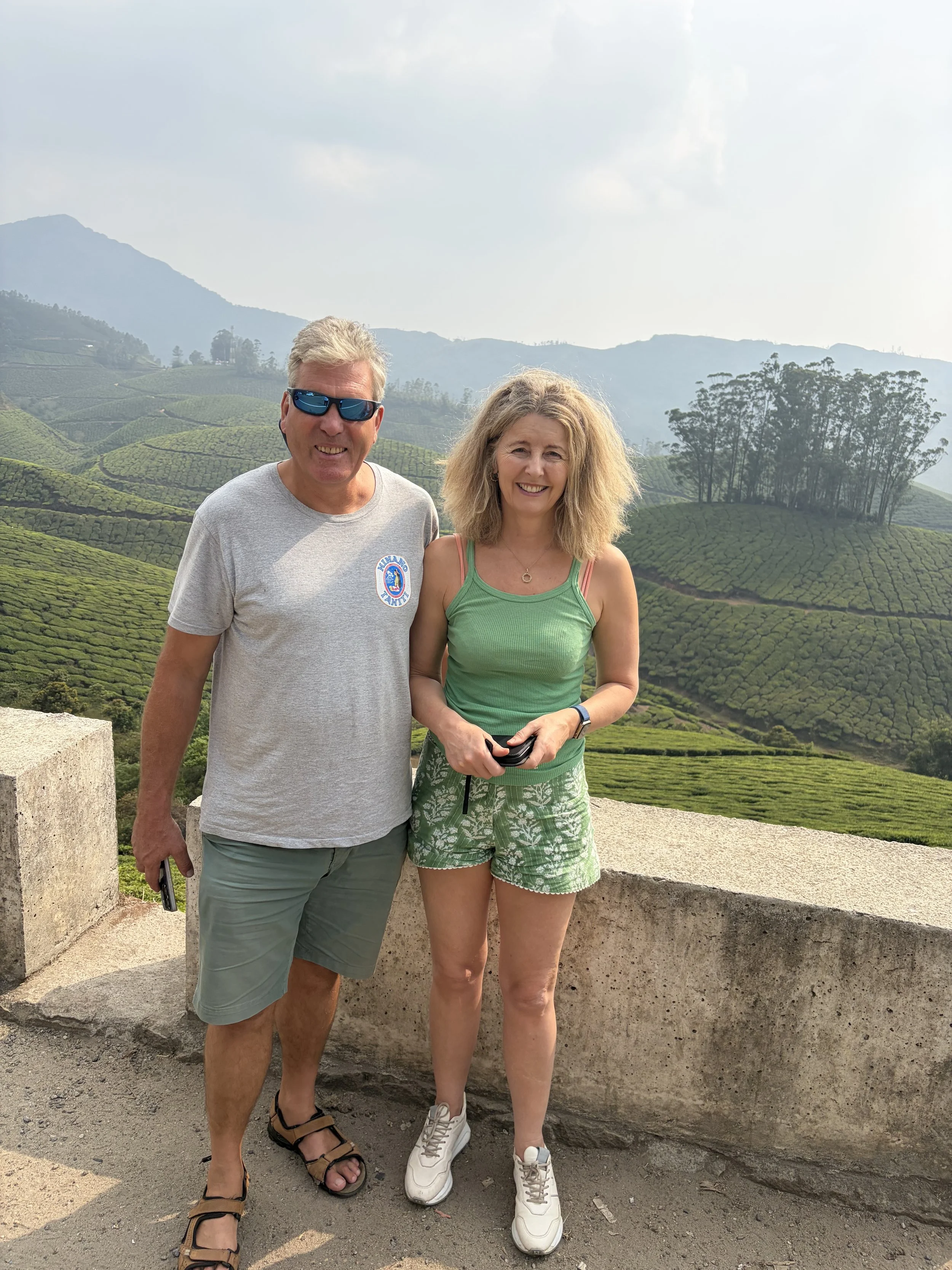 The picture of the day is Jules and I with the tea plantations behind.