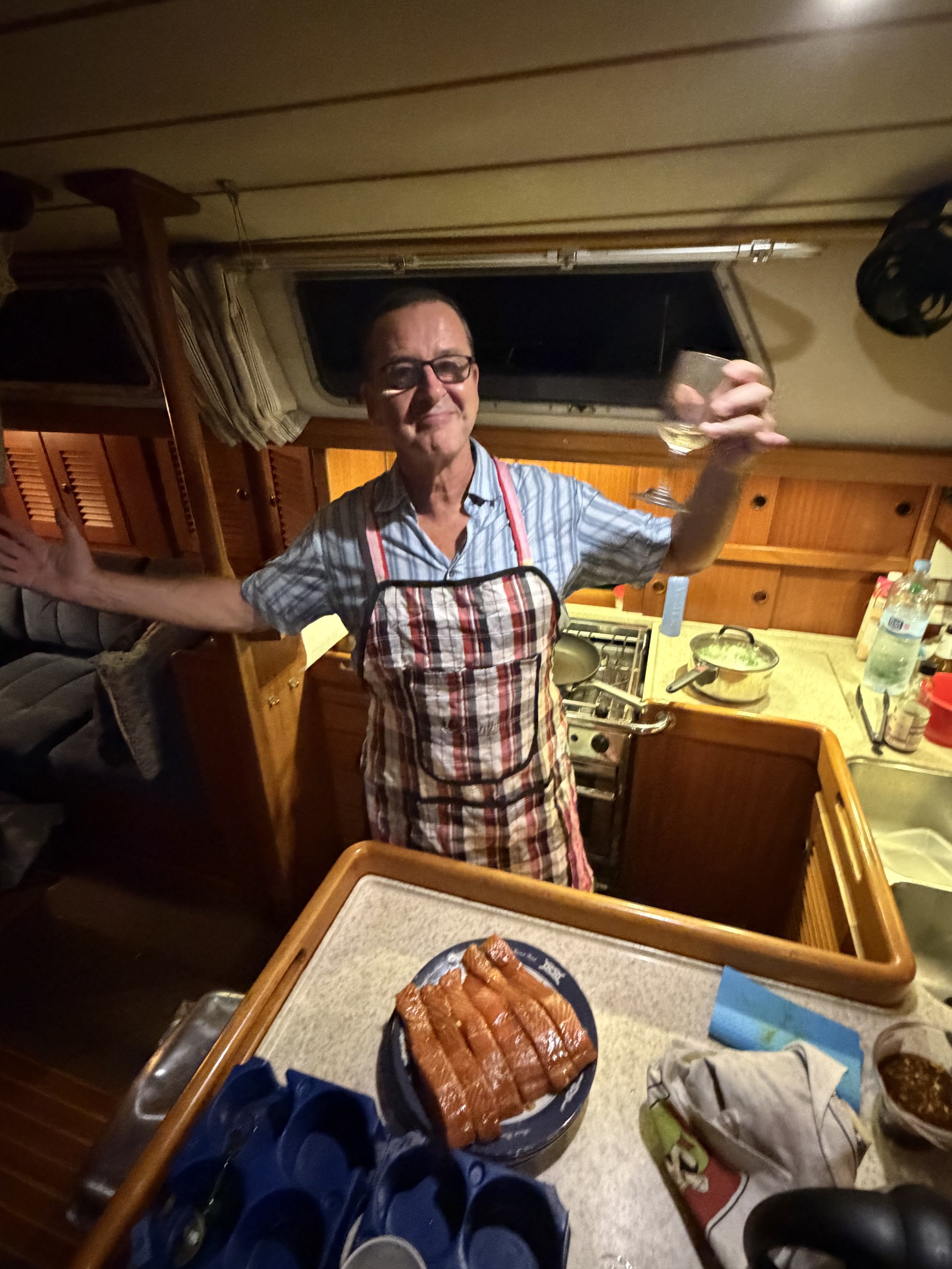 We then all went off for a shower and to freshen ourselves up. We then had a well-earned sundowner and then Rhys cooked a great meal or salmon with soy sauce, rice and peas which was delicious. I was grateful that he had volunteered to cook our first meal on board and he certainly set a high standard for others to follow.