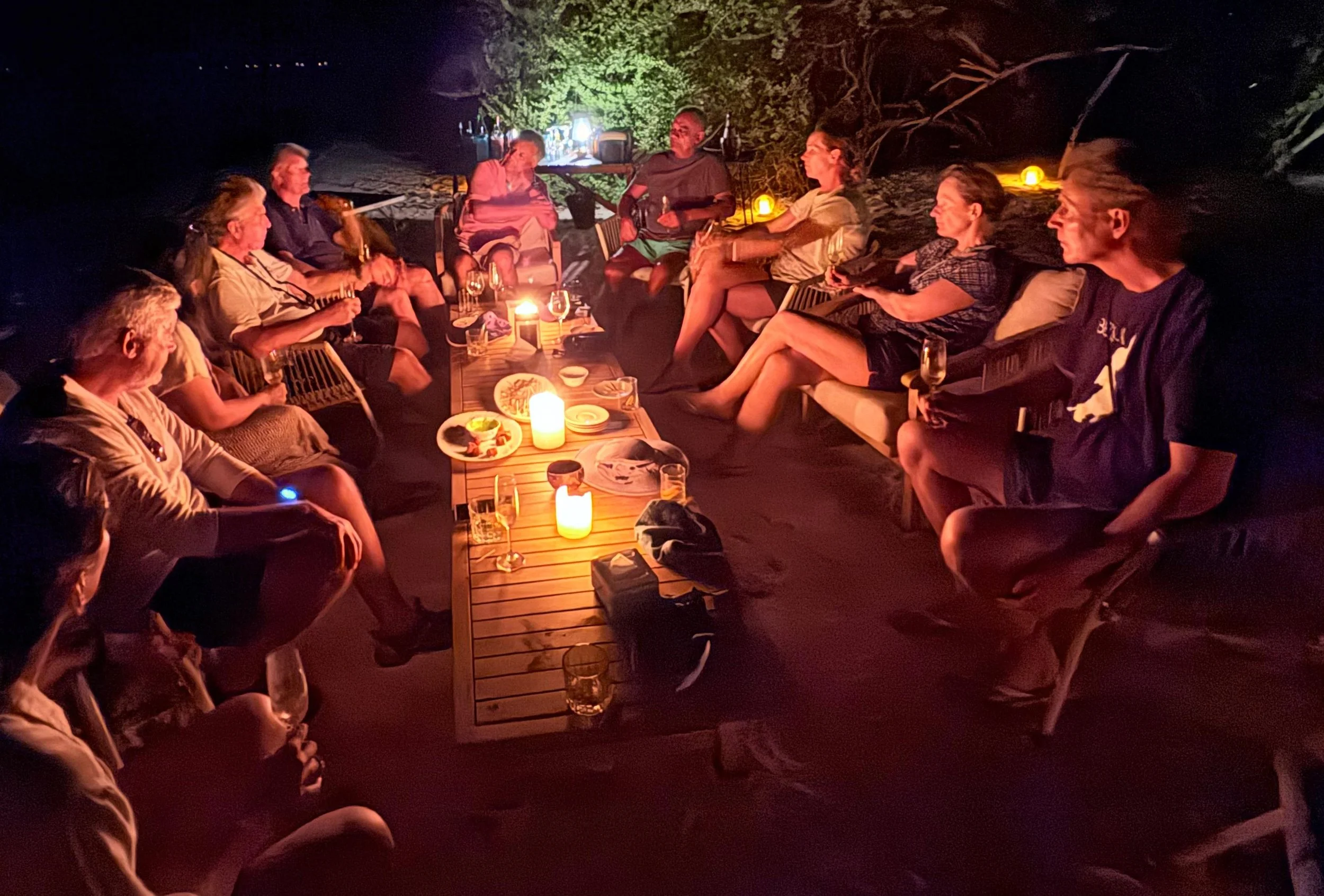We came ashore and were then led to a candle it and fairy light area on the beach and we had another pre dinner drink and some nibbles – delicious lobster and red snapper goujons. Parth had heard that J & Miranda were recently married so he found a bottle of Moet and we kindly toasted them and thanked our guests.